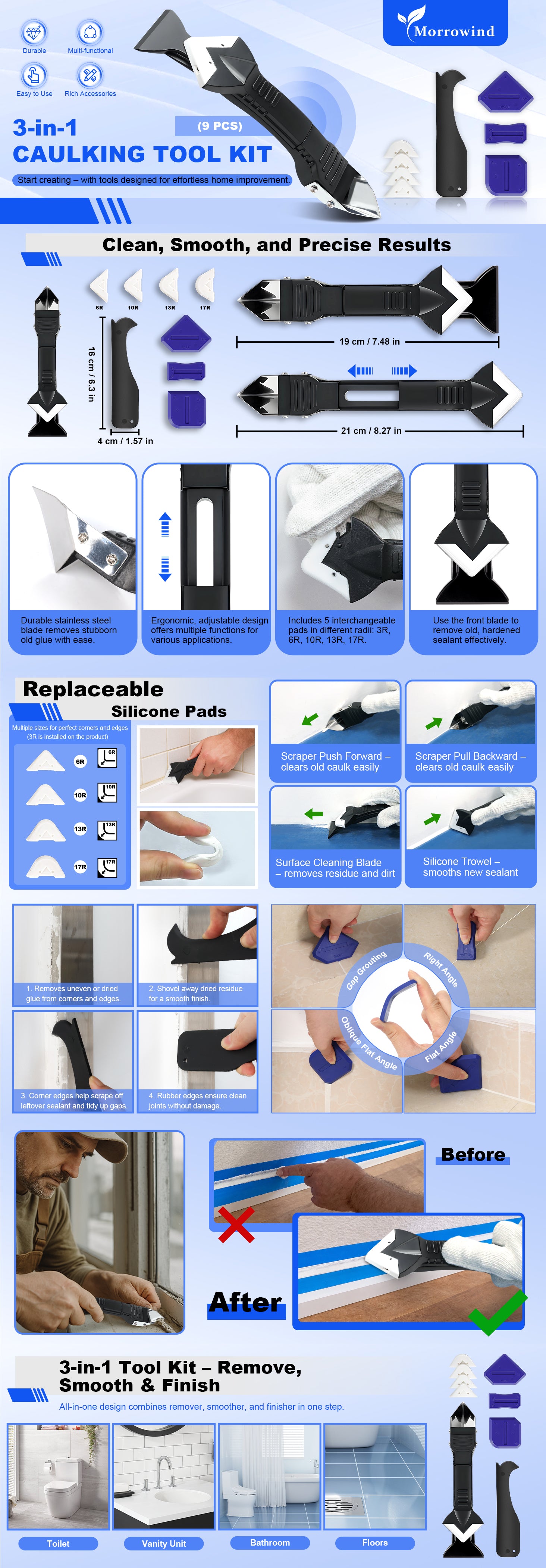 - Upgraded 3-in-1 Caulking Tool Kit: silicone kit combines caulk remover, grout scraper, silicone smoother, and glass glue angle tool for removing old caulk, smoothing new sealant, and achieving professional results
