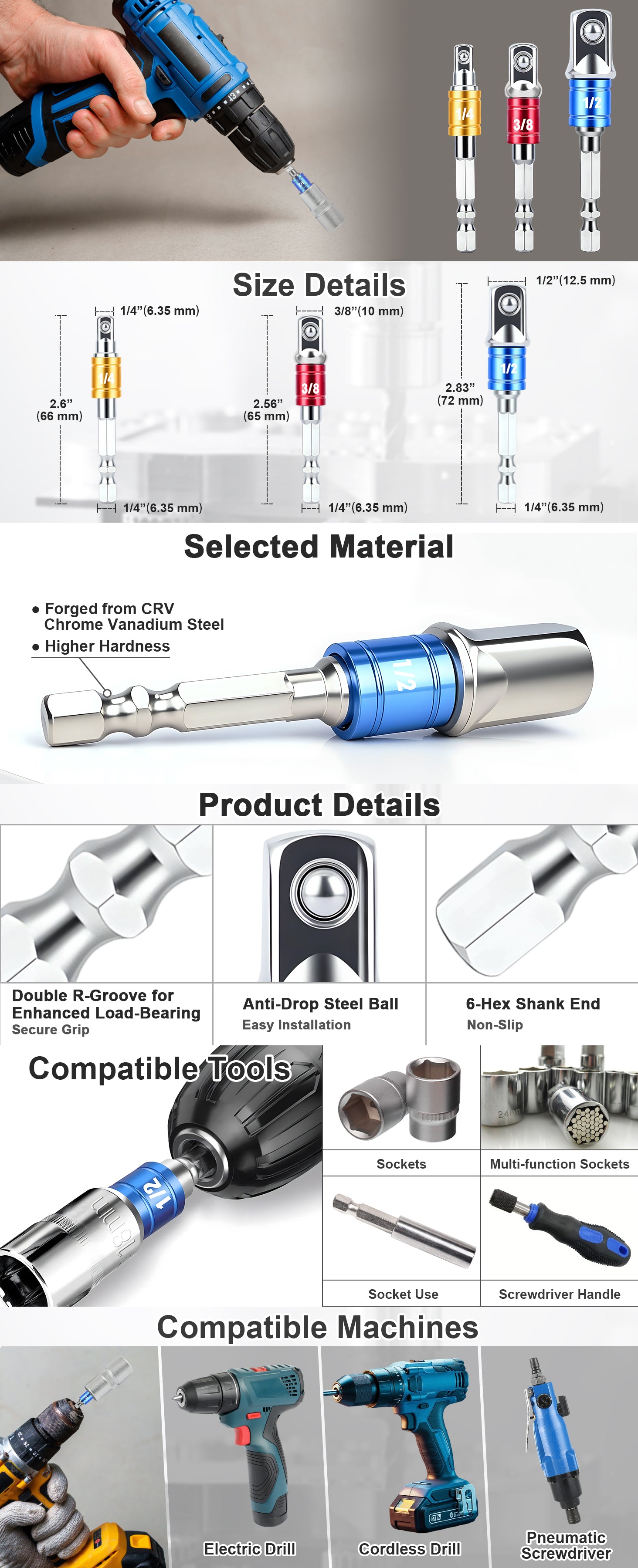 - Built to Last: Premium Chrome Vanadium Steel: crafted from hardened CR-V (Chrome Vanadium) steel, these adapters excel in hardness and wear resistance. They outperform ordinary carbon steel with better durability and corrosion resistance, ensuring reliable performance in demanding automotive and mechanical tasks