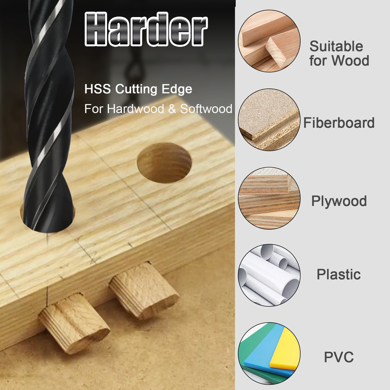 HSS Dual-Cutting Edges – Made of high-speed steel with dual cutting edges for sharp, wear-resistant performance. Delivers fast penetration in both hardwood and softwood while keeping hole walls smooth and clean.