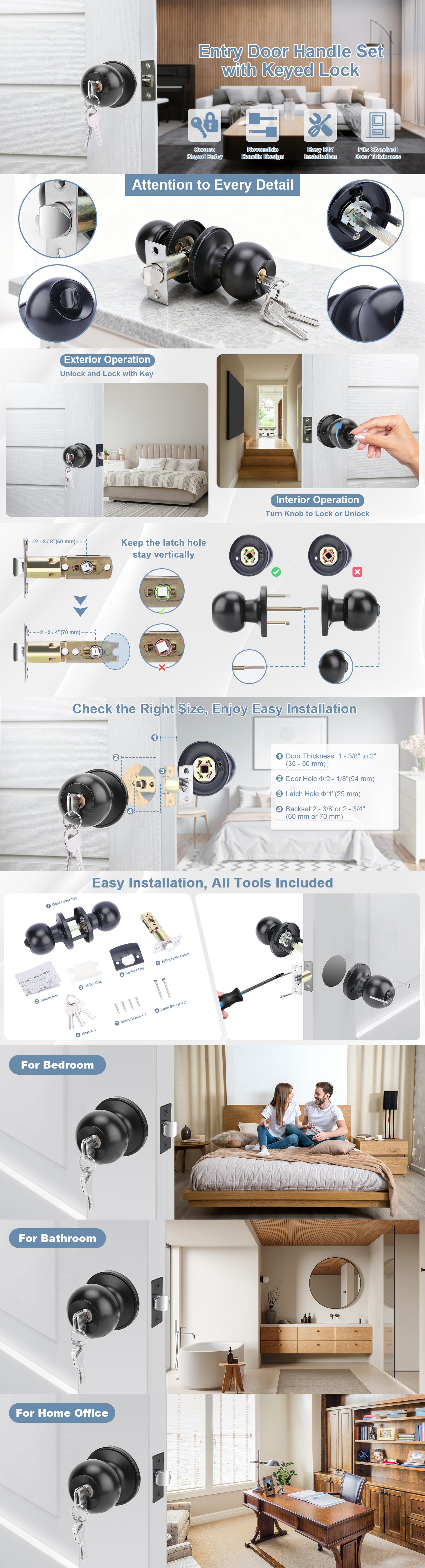 - Fits Standard Door Thickness: Supports doors 35-50 mm (1-3/8 in-1-3/4 in) thick. Adjustable latch fits backsets of 60 mm (2-3/8 in) or 70 mm (2-3/4 in), compatible with most doors.
