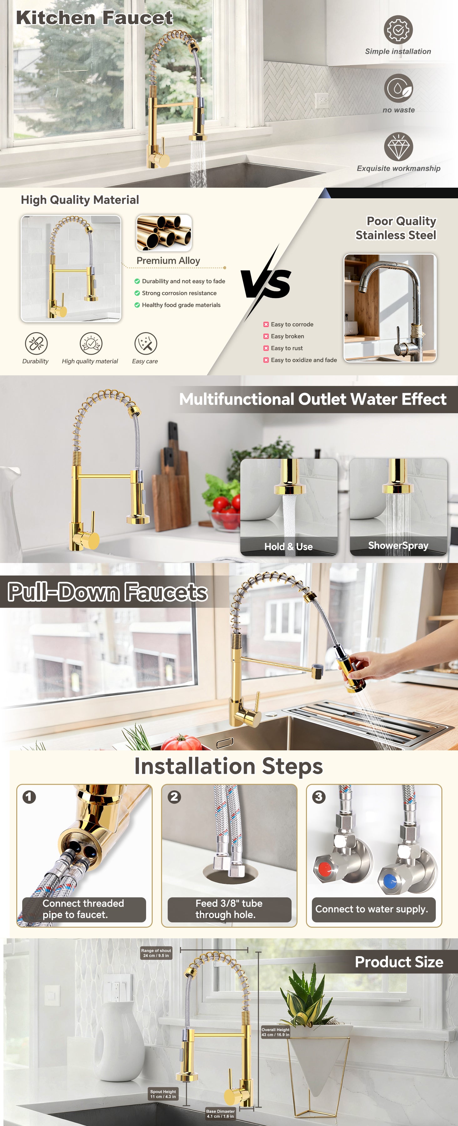 - Modern Minimalist Design: single-handle control with spring pull-down faucet, suitable for kitchens and bathrooms; gold finish complements various decor styles
