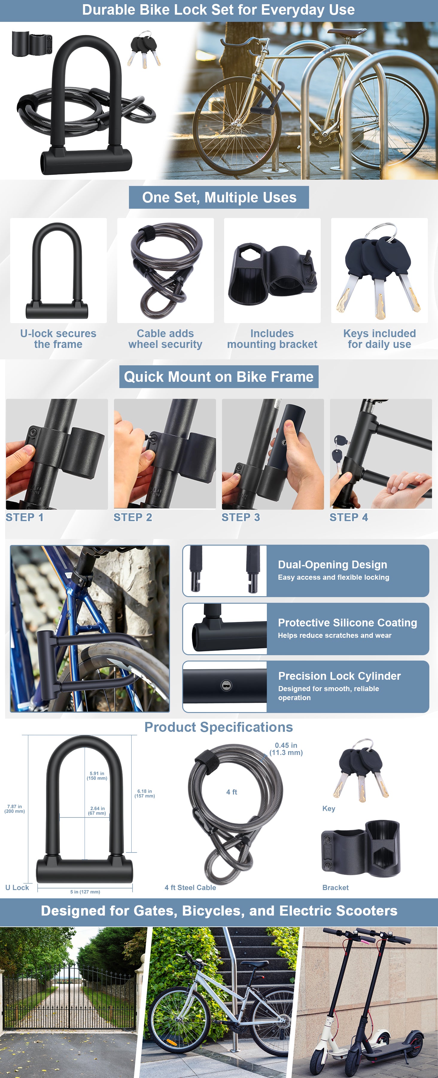Heavy-Duty U-Lock & 4ft x 0.47in Security Cable, Vinyl-Coated Steel Wire for Maximum Protection