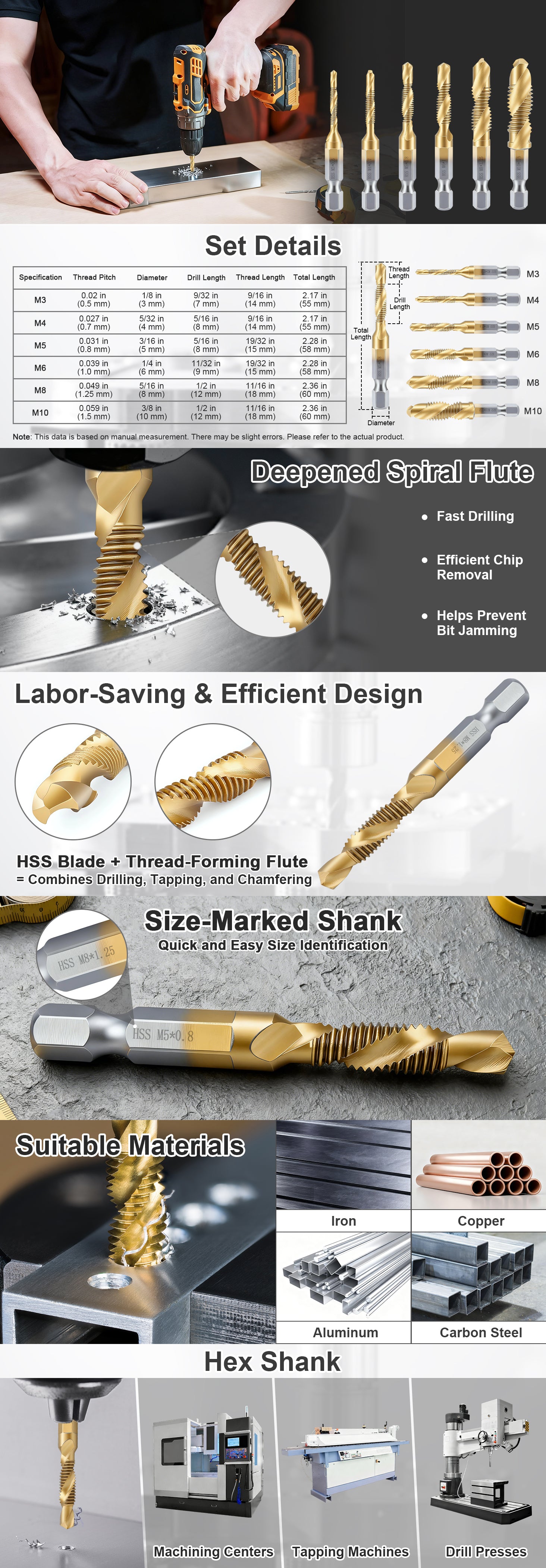 - HSS Spiral Cutting Blades: Wear-resistant HSS material with high cutting efficiency delivers sharp drilling on soft metals, thin sheets, and plastics, allowing drilling, tapping, and deburring in one step.