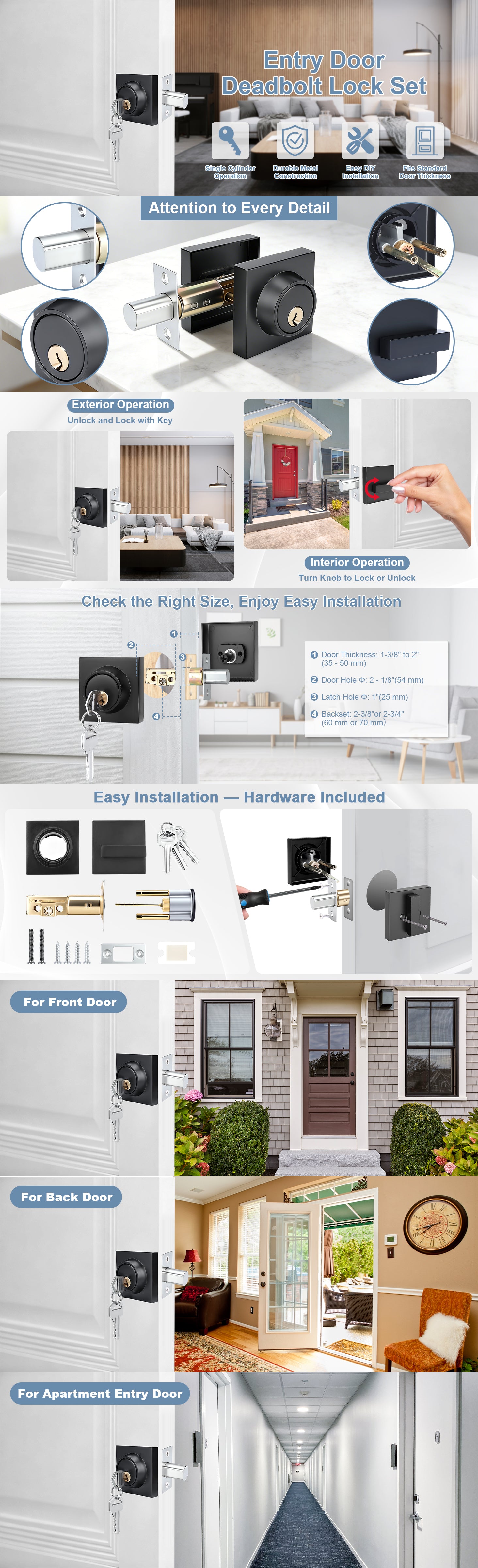 - Standard Specifications, Wide Compatibility: suitable for door thicknesses between 30mm and 50mm (1-3/16 inches to 1-15/16 inches). The adjustable latch is compatible with door backsets of 60mm (2-3/8 inches) or 70mm (2-3/4 inches), meeting the installation needs of most residential doors.