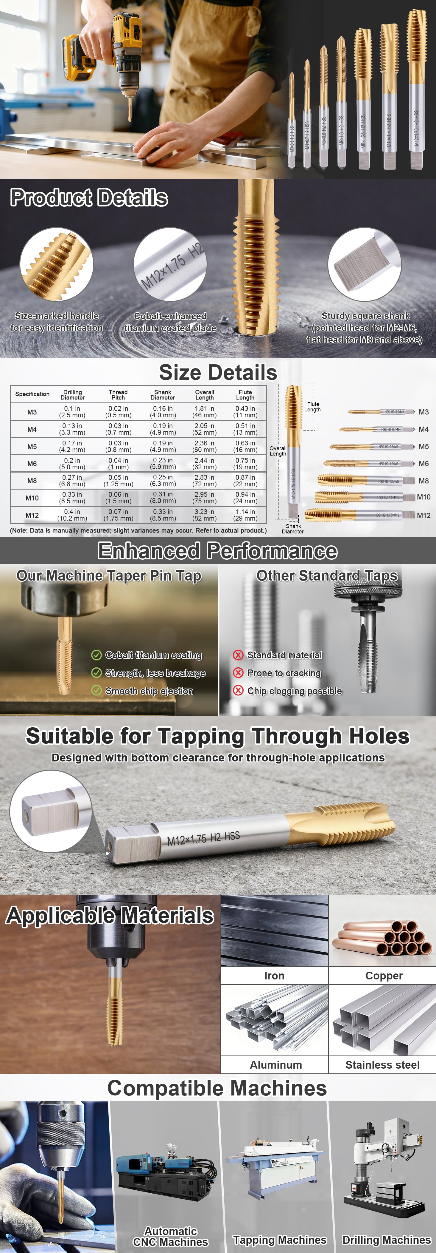 - Square Shank Design: The square shank is compatible with drill presses, tapping machines, and automatic machines. Due to the high hardness of the titanium-coated taps, hand drills are not recommended for tapping. M2–M6 have pointed tips; M8 and above have flat tips.