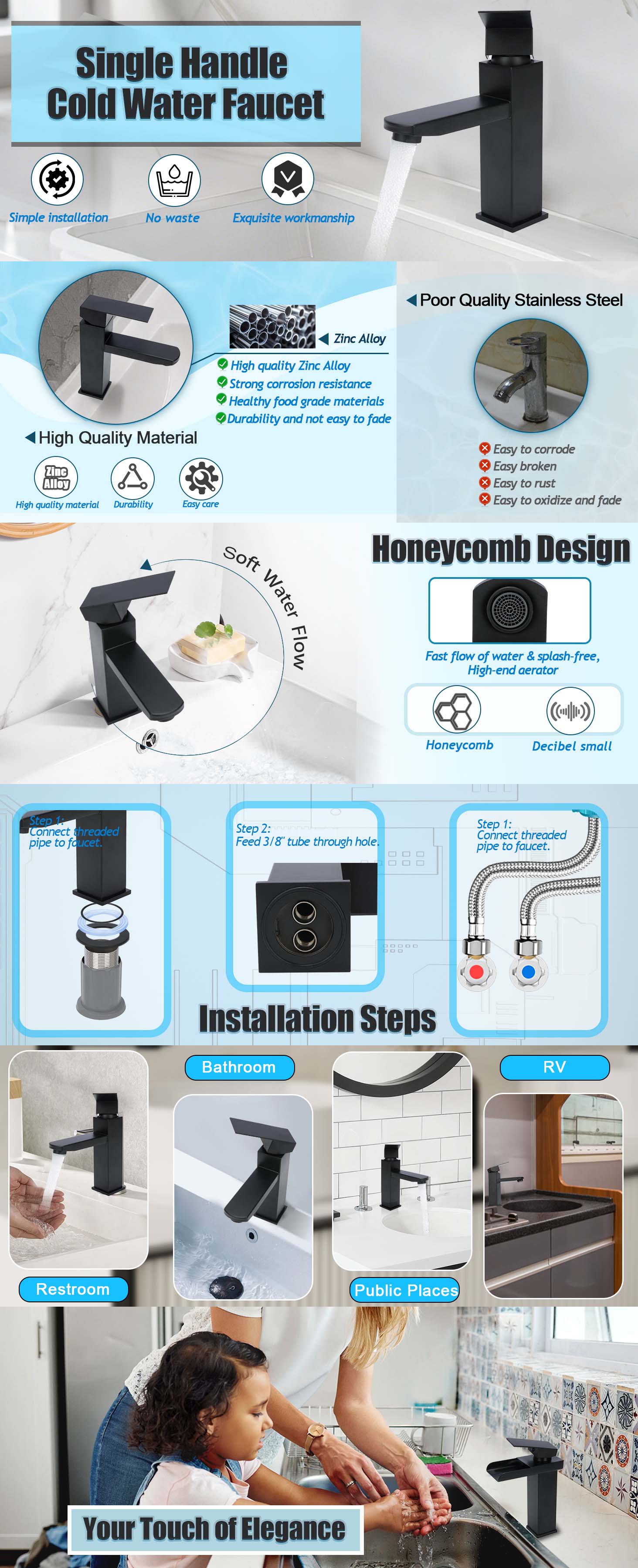 - Quick Single-Hole Installation: compatible with standard single-hole countertops (decorative cover plate not included). Comes with a 60 cm inlet hose (3/8" connection) for fast and easy setup